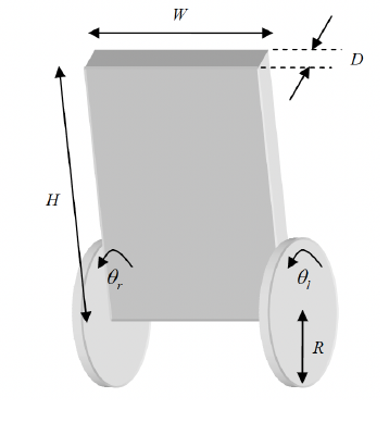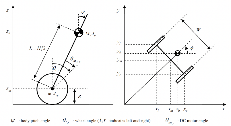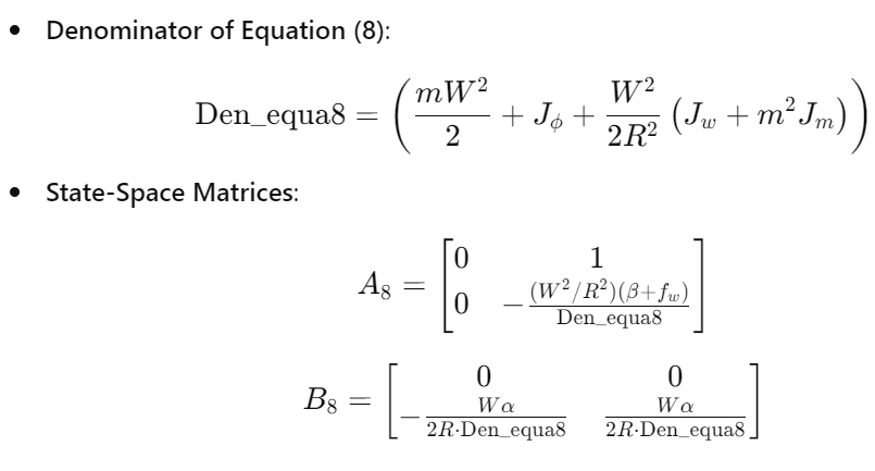 The systemβs state-space representation was derived by modeling the robotβs motion using the Lagrangian method. The following matrices define the system: