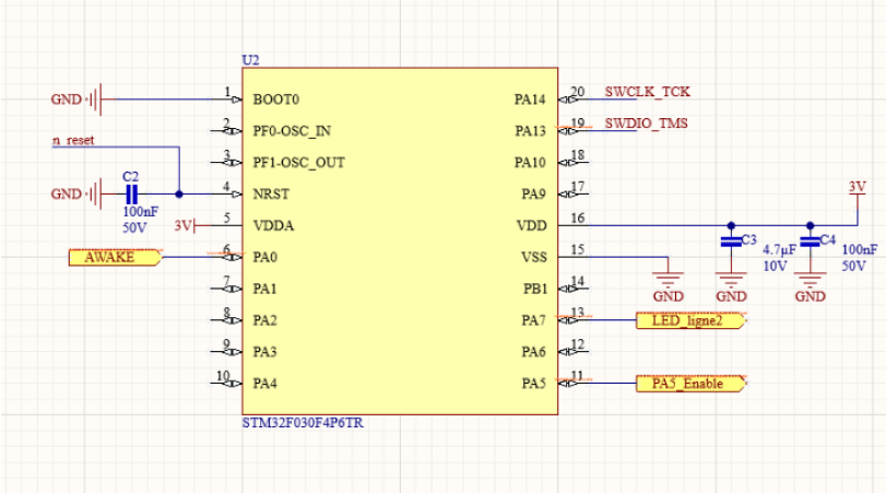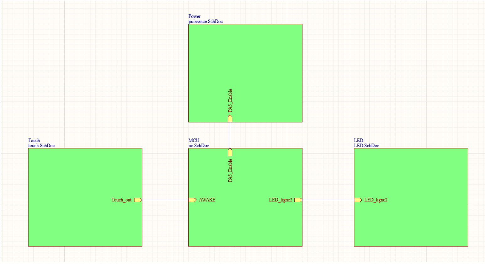 The next step was to create the electronic schematics in Altium Designer. The main subsystems of the circuit include: