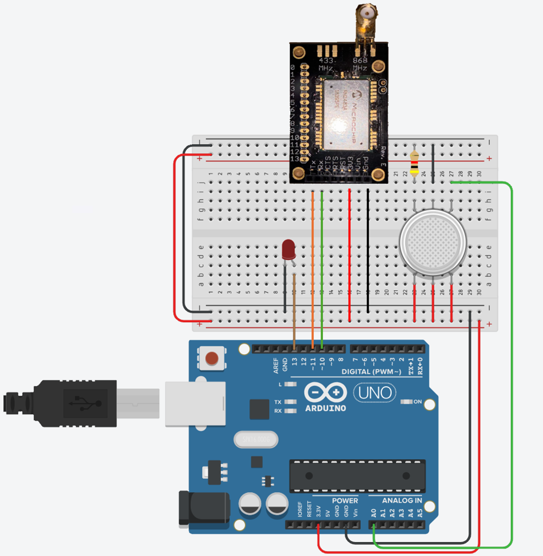 - Power: Arduino powered via USB, LoRa module powered through the 3.3V pin.