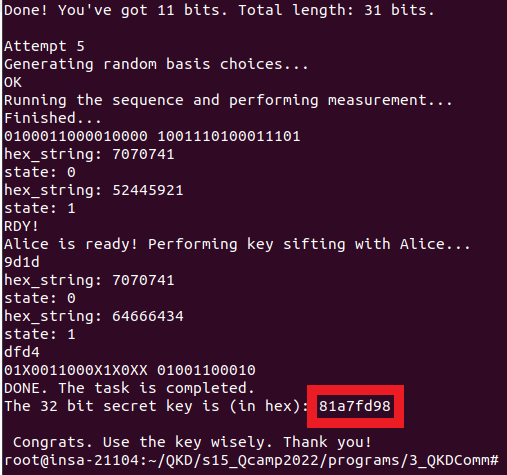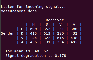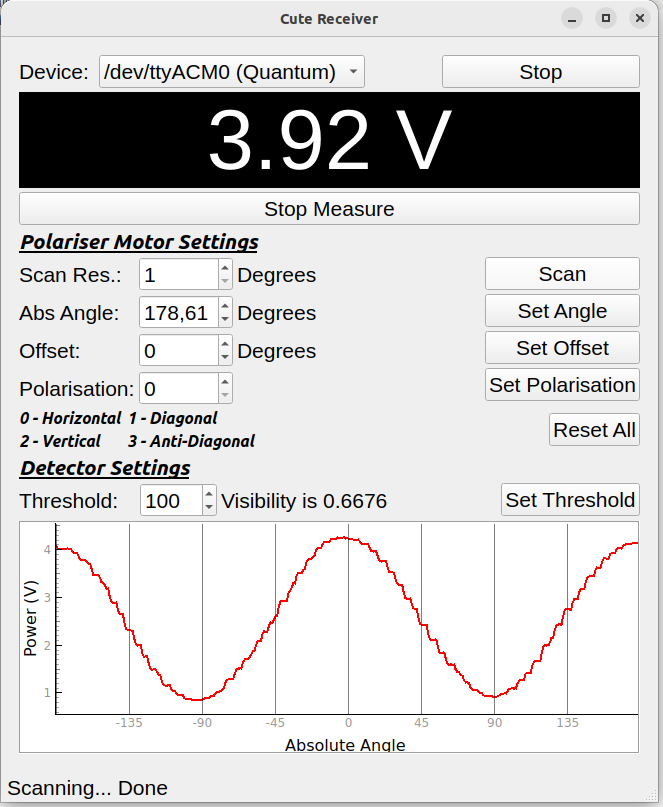 After completing the classical test using /dev/tty1CM0, we proceeded with the quantum test on /dev/ttyACM1. Initially, we performed a calibration by setting the angle to 0, scan resolution to 1, offset to 0, and polarization to 0. We then converted the luminosity signal into voltage by scanning and measuring the intensity after the linear polarizer as it rotated through a full 360 degrees. Following the calibration, we executed a Python script to automate key distribution and generate a 32 kbit key.