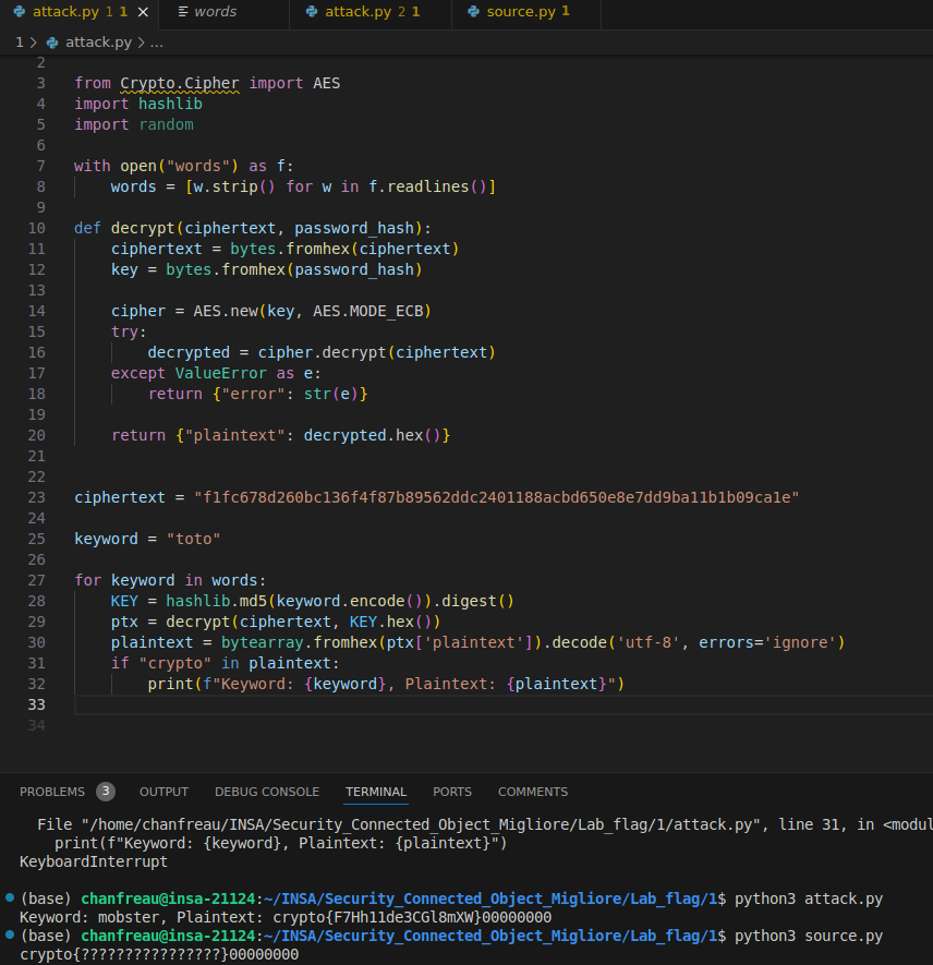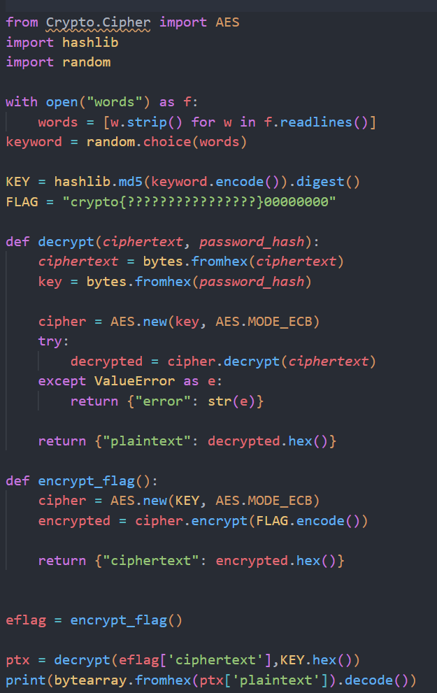 Flag Encryption The predefined flag is padded to a multiple of the AES block size (16 bytes) and encrypted using the generated key in ECB mode.