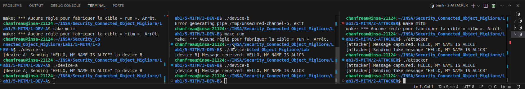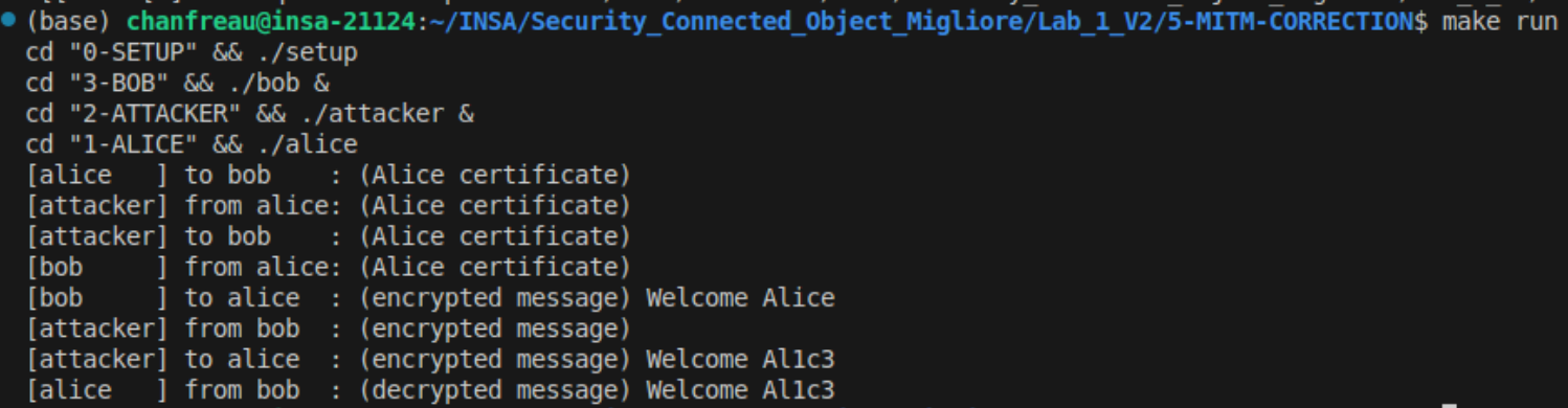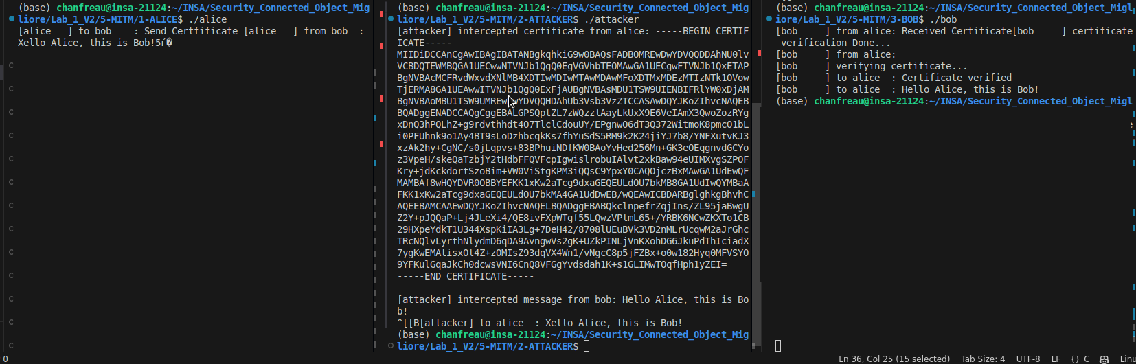 For example, in the attacker file we implemented a simple MITM attack using the mbedTLS library where the attacker intercepts and modifies messages between Alice and Bob. The attacker reads the message from Bob, alters it, and then sends the modified message to Alice. This demonstrates how an attacker can manipulate the communication between two parties, highlighting the importance of securing communications to prevent such attacks.