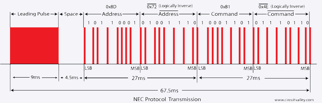 - NEC Format: The NEC protocol uses a 32-bit data frame. For the character “A”, the signal data would be encoded as follows: